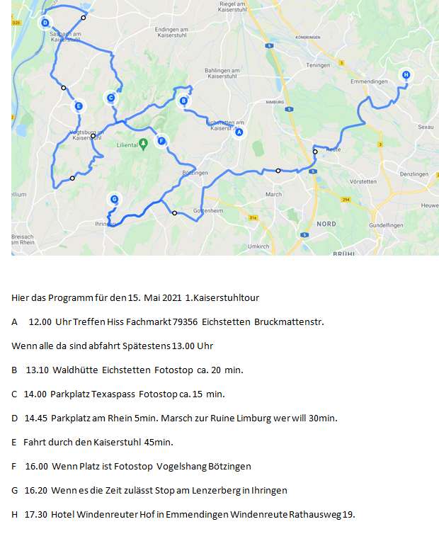Hallo 8er Freunde habe heute mit dem Hotel Krone gesprochen und sie muss leider alle Buchungen Stornieren . Sie wird auch keine Geschäftsreisende die mit einem 8er kommen beherbergen da es dann offensichtlich ist das es eine Touristische Übernachtung ist. Da das Hotel genau 20m neben der Polizei liegt will sie auch kein Risiko auf der Zielgeraden machen und eine Strafe von 25t€ bezahlen. BITTE UM VERSTÄNDNIS. Das Kaiserstuhl treffen findet aber auf jeden fall statt , ich werde die Tour noch etwas anpassen und den Abschluß am Europa Park machen. Wenn doch noch jemand Übernachten will bitte selber darum kümmern.