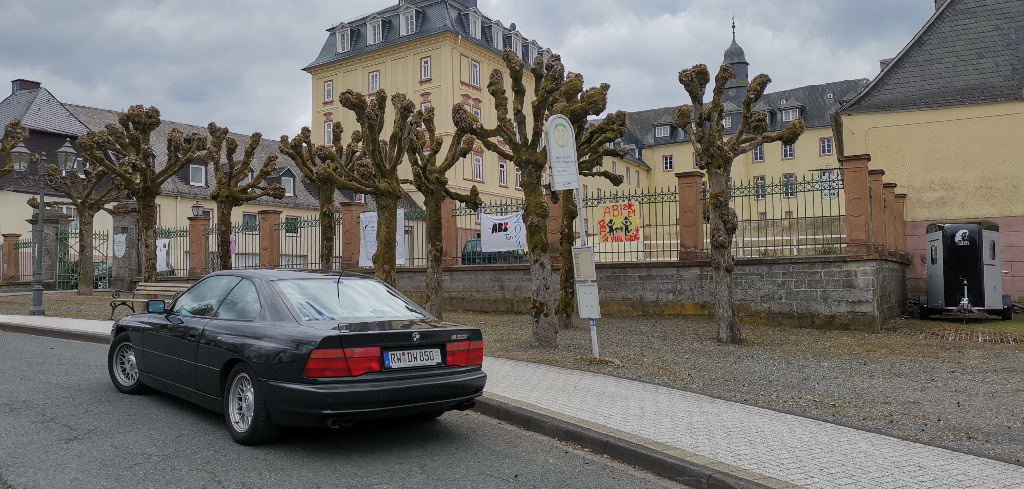 Im Kreisverkehr vor dem Schloss fanden wir Platz. Das Schloss wurde umgebaut zu einem Hotel und ist in privater Hand.