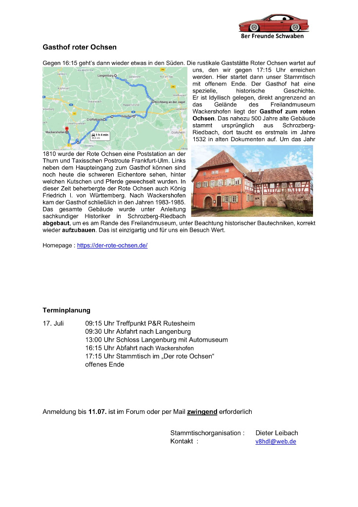 ca. 16:30 Uhr Abfahrt nach Wackershofen, ca. 17:15 Stammtisch im " Gasthof zum Roten Ochsen " offenes Ende.