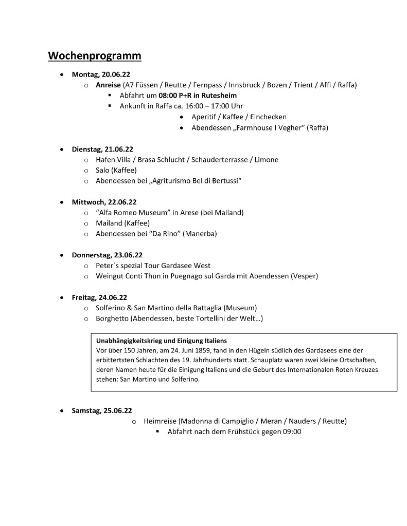 Jochen aus unserer Gruppe hat für den Gardasee eine tolle Tour geplant. Leider ist aufgrund des Hotels die Teilnehmerzahl auf 5 8er begrenzt. Mehr Zimmer gibt es dort nicht und es wurde das ganze Hotel gebucht.