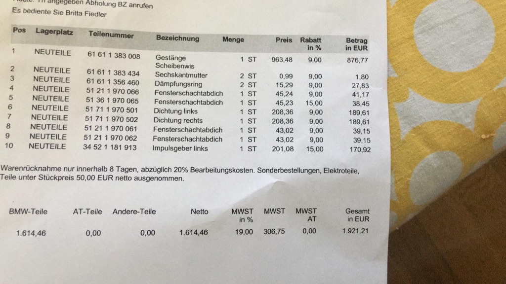 1. BMW kennt nur eine richtung für Ersatzteilpreise und die geht steil nach oben . Kann Dir also nächsten Monat schon passieren das das Ding 1,5k kostet , kein Scherz !
