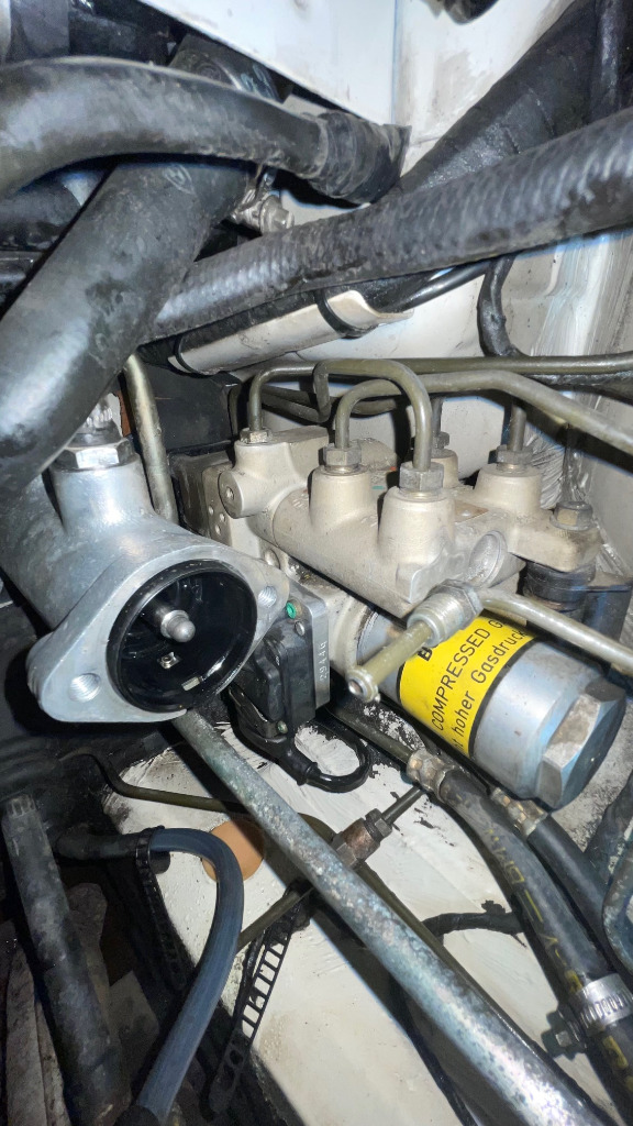 Fahrzeug steht auf der Bühne, Räder leicht angehoben. Motor im Standgas. Grund: Durchführung der Entlüftung Servohydraulik (Pentosin) nach Neubefüllung. Hydroaggregat zunächst stromlos / runder Verbindungsstecker in Nähe des Wasserventil (irrtümlich) nicht verbunden. Das Nichtverbinden dürfte aber schadlos möglich sein, da das Werkstatthandbuch sogar das Abklemmen des ganzen Steuergerätes zwecks Entlüftung vorsieht.