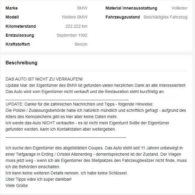 Meisten verschwinden Autos spurlos - hier ist es genau umgekehrt. Es wird der Besitzer zum Auto gesucht: BMW 850 840 E31 Eigentümer gesucht