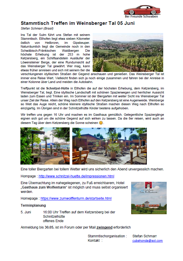 am 5. Juni soll ja der Stammtisch Weinsberg stattfinden davor wollen wir noch eine kleine Ausfahrt machen.