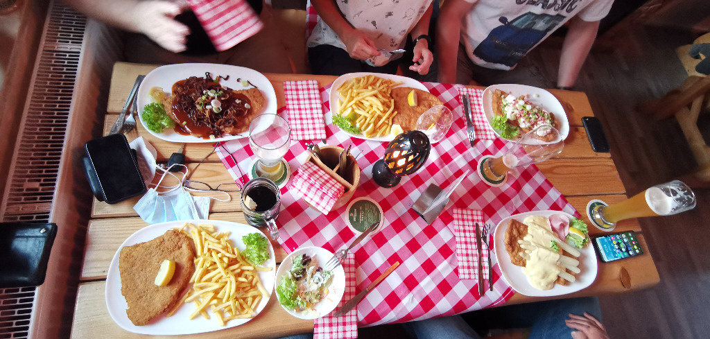 Dann laufen wir gegen 16:30 auf die Schnitzelhütte, ca. 20 min.