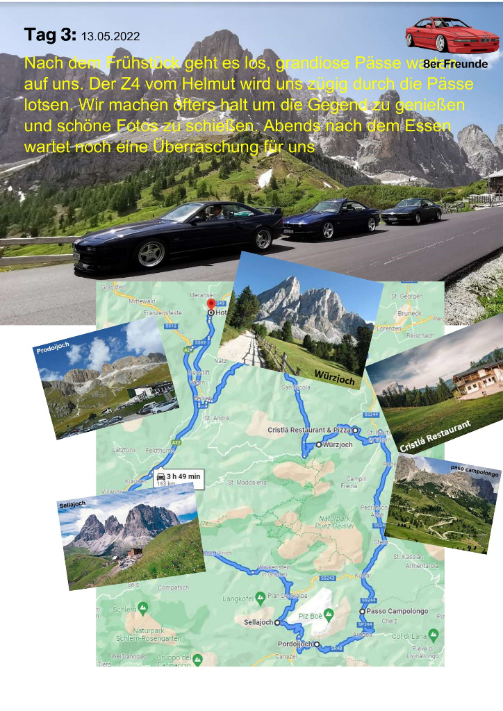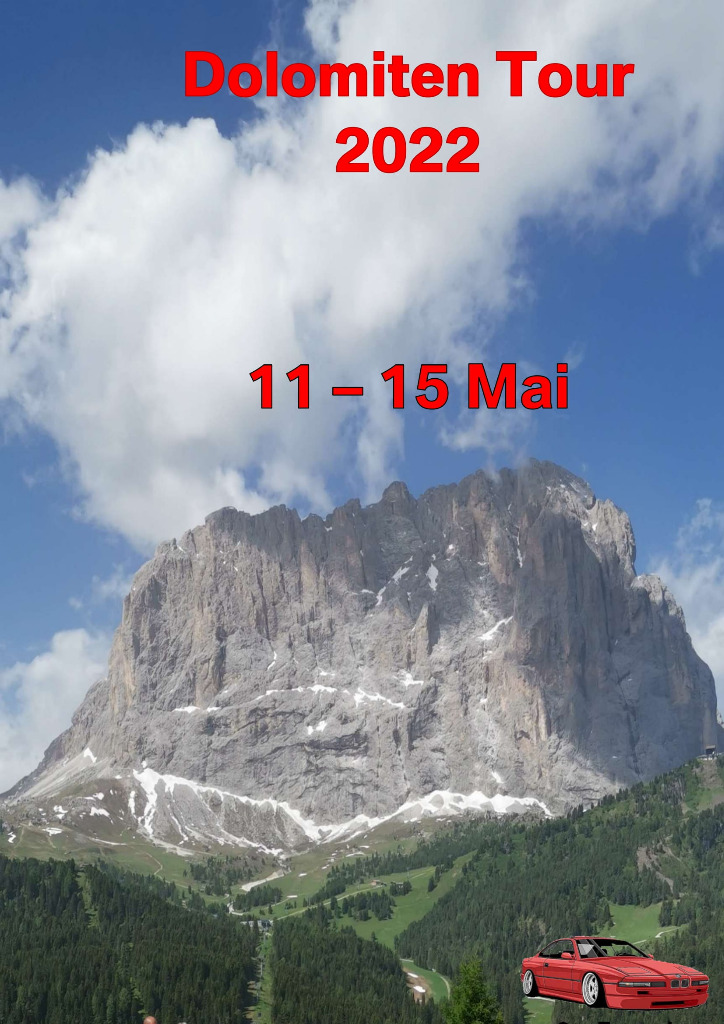 unsere Planung für die Dolomiten Tour 2022 ist fertig. Wer mit mag, einfach melden. Egal mit welchem Auto. wir haben diesesmal den Schwerpunkt Cabrio's... Auch ist die Tour auf max. 10 Fahrzeuge geplant. Soviele Zimmer sind halt geblockt. Sollten es mehr werden, versuchen wir nachzubuchen. Es wird sich dan schon eine Lösung finden...