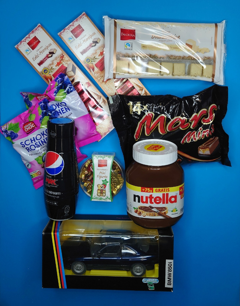 Das "Care Paket" enthält Dinge die er mag und ein paar Bilder von früheren Club Tagen, sowie ein blaues 850i Modell wie sein eigener 8er.