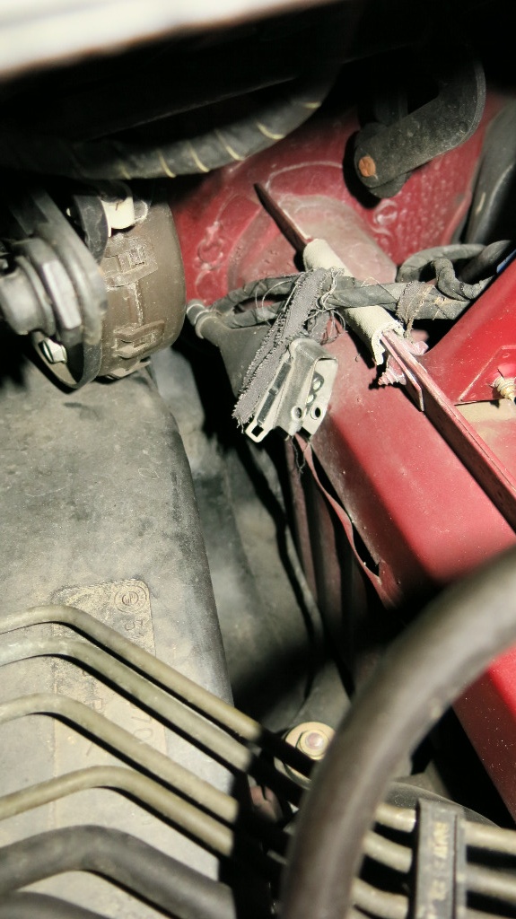 Bei Durchsicht des Motorraums bin ich auf ein "blindes" Kabel gestoßen. Es befindet sich örtlich unterhalb des Scheinwerfers auf der Fahrerseite und ist dort mit (ich würde sagen) Original Tape zurückgebunden.