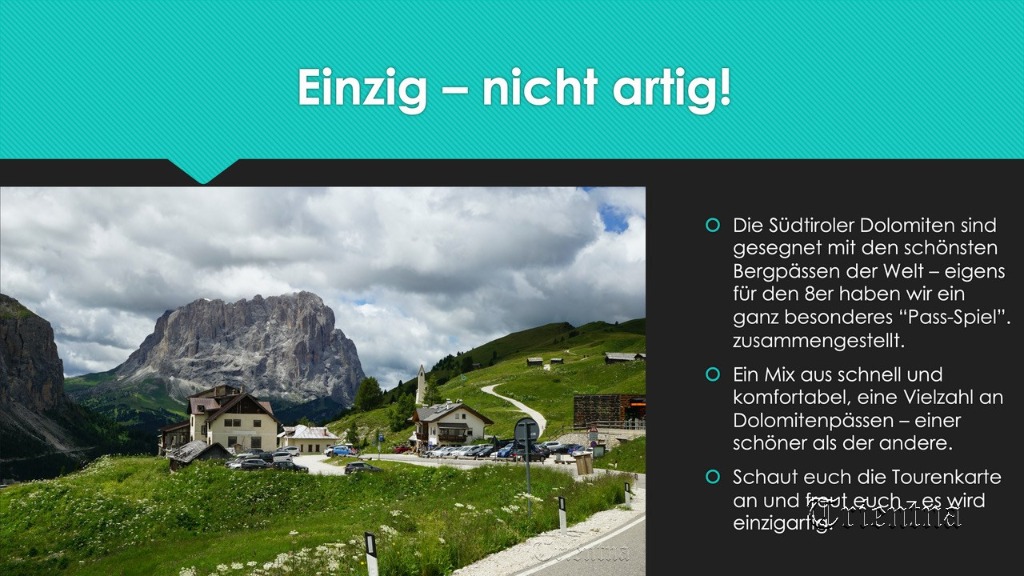 Das schöne an den geplanten Touren ist, dass man sich nicht auskennen muss und die schönsten Flecken der Dolomiten gezeigt bekommt.
