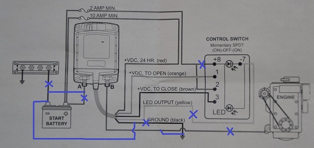 Dort wird typischerweise Plus geschaltet während ich hier Masse schalte. Der Schaltplan ist hier, das Herstellerblatt zeigt die Plus-Schaltung, in blau ist die Änderung der Verdrahtung für das Schalten von Masse. Bei dem Bauteil rechts handelt es sich um einen Taster mit Mittelstellung "null" und Umschalterfunktion. Wenn man in einer Richtung drückt werden 1 und 2 verbunden, wenn man in die andere Richtung drückt werden 2 und 3 verbunden. Es reicht ein Antippen.