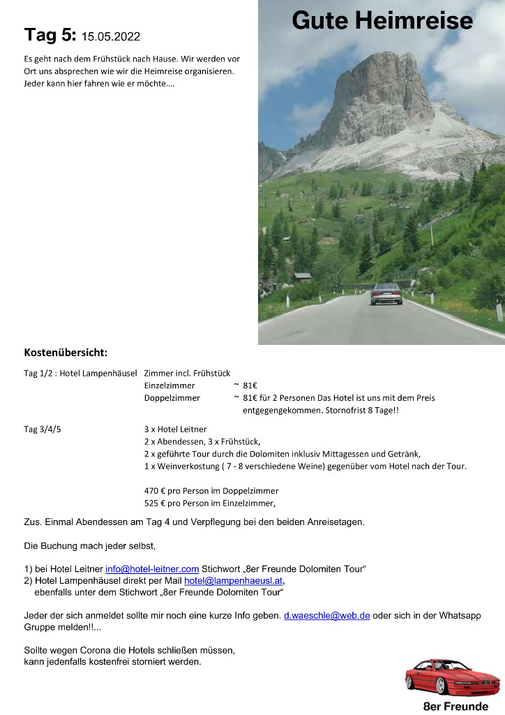 unsere Planung für die Dolomiten Tour 2022 ist fertig. Wer mit mag, einfach melden. Egal mit welchem Auto. wir haben diesesmal den Schwerpunkt Cabrio's... Auch ist die Tour auf max. 10 Fahrzeuge geplant. Soviele Zimmer sind halt geblockt. Sollten es mehr werden, versuchen wir nachzubuchen. Es wird sich dan schon eine Lösung finden...