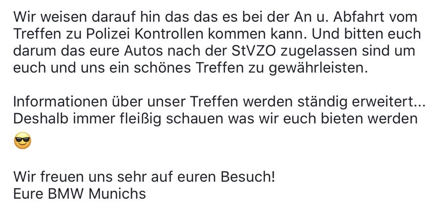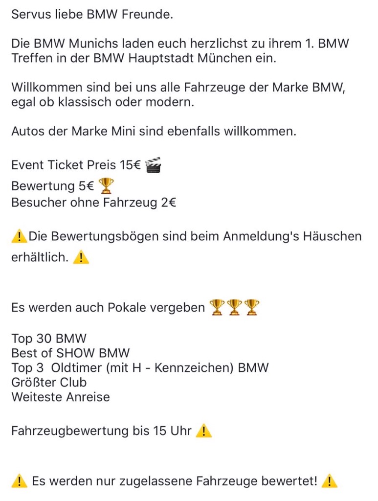 möchte euch informieren dass es diesen Sonntag 10.06.2018 der 1.Int. BMW Treffen München stattfindet.