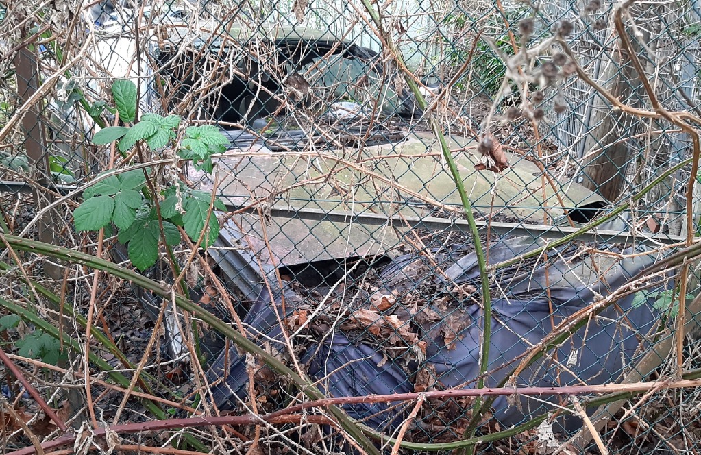 Auf dem zweiten Bild sieht man, dass die Oberseite der Armaturenhaube nicht mehr intakt ist und am unteren Scheibenrahmen irgendetwas geschmolzen ist. Auch die Motorhaube ist grösstenteils ohne Lack, verformt und rostig, der Windabweiser nicht mehr vorhanden.