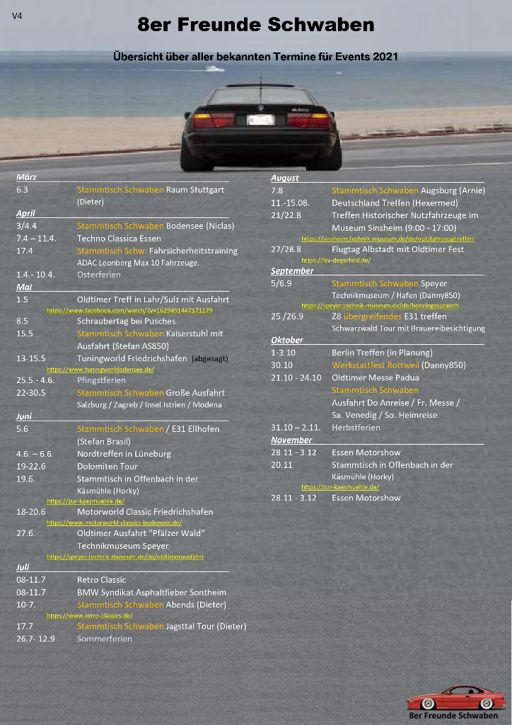 wir haben wir hier für alle 8er Fan's einen übergreifenden Terminkalender erstellt, den wir immer aktualisieren.