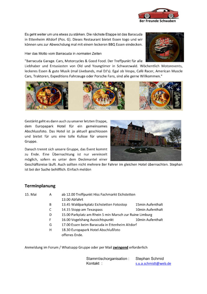 Hallo 8er Freunde habe heute mit dem Hotel Krone gesprochen und sie muss leider alle Buchungen Stornieren . Sie wird auch keine Geschäftsreisende die mit einem 8er kommen beherbergen da es dann offensichtlich ist das es eine Touristische Übernachtung ist. Da das Hotel genau 20m neben der Polizei liegt will sie auch kein Risiko auf der Zielgeraden machen und eine Strafe von 25t€ bezahlen. BITTE UM VERSTÄNDNIS. Das Kaiserstuhl treffen findet aber auf jeden fall statt , ich werde die Tour noch etwas anpassen und den Abschluß am Europa Park machen. Wenn doch noch jemand Übernachten will bitte selber darum kümmern.