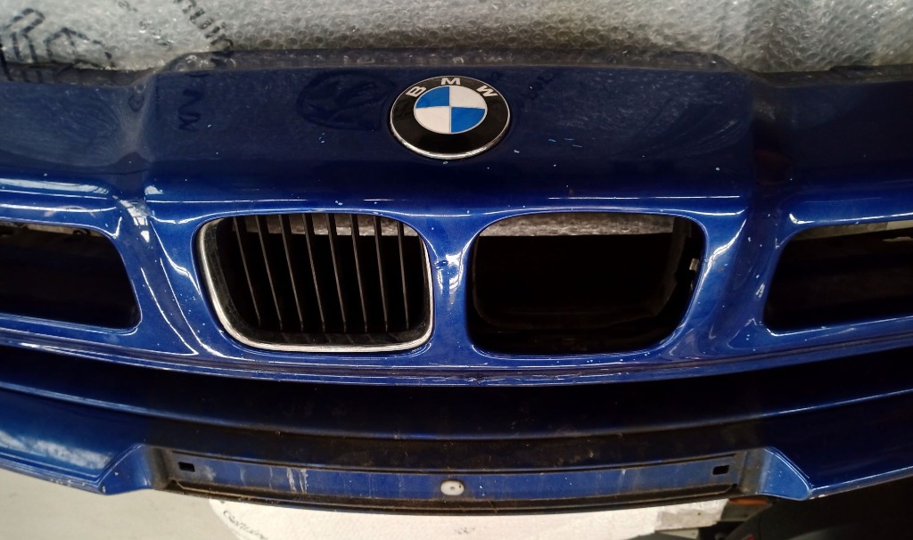 Die (originalen) Teile stammen von einem 850i Bj. 1992 und sind in einem guten, verwendungsfähigen Zustand. Die Farbe ist tobagoblau. Leichte Lackschäden sind vorhanden, der Steg zwischen den Nieren ist leicht eingedrückt, aber offenbar nicht gebrochen (s. Fotos). Die Ziergitter (Nieren) sind äußerlich unbeschädigt, es kann aber sein, dass Halterungen gebrochen sind.