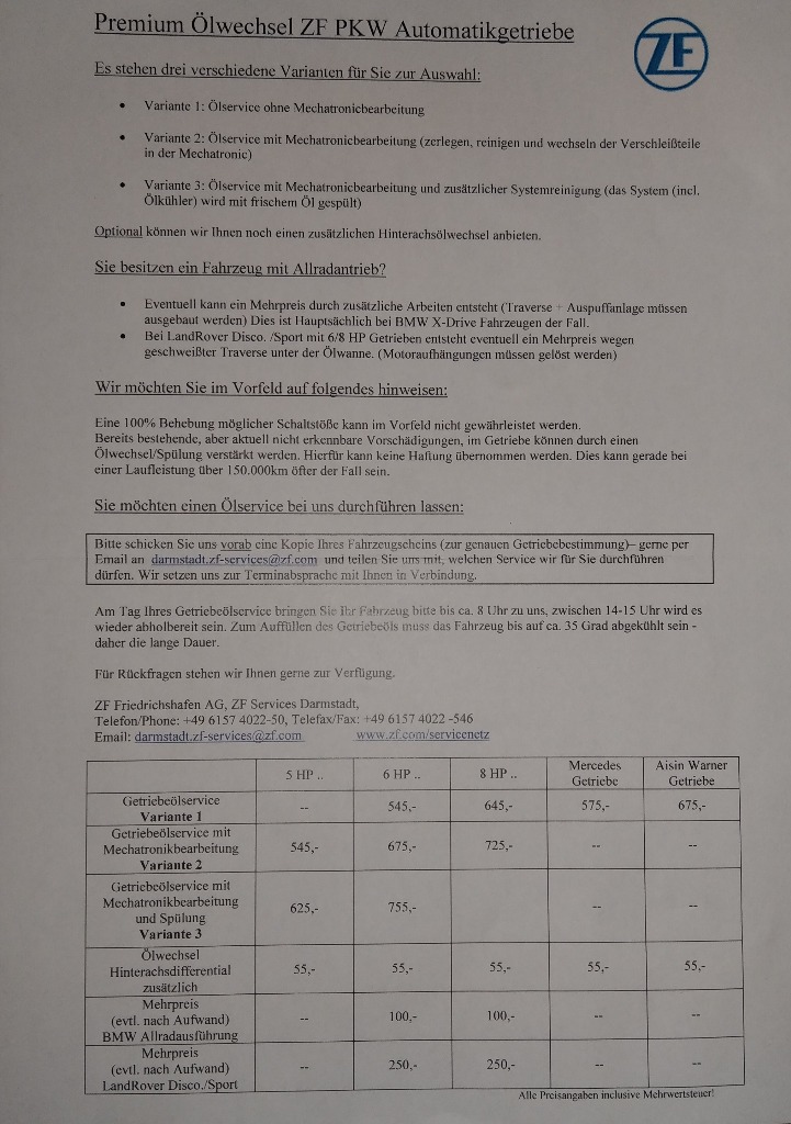 Aber du kannst den Service eigentlich in jeder ZF-Stelle machen lassen.