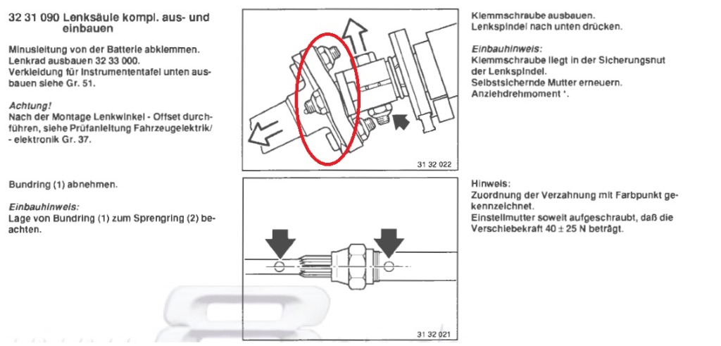 Mein erster Weg führte mich zur Lenkstange im Fußraum, wo ich die Überwurfmutter fester geschraubt habe (diese war sehr locker - warum eigentlich?). Damit war das klackernde Geräusch beseitigt und das Spiel bereits wesentlich geringer.